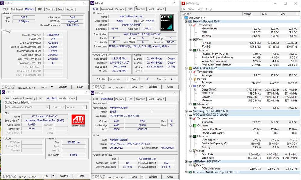 Sistemul este HP 6005 tip SFF, cu CPU AMD Athlon II X2 220 si 8GB RAM DDR3.